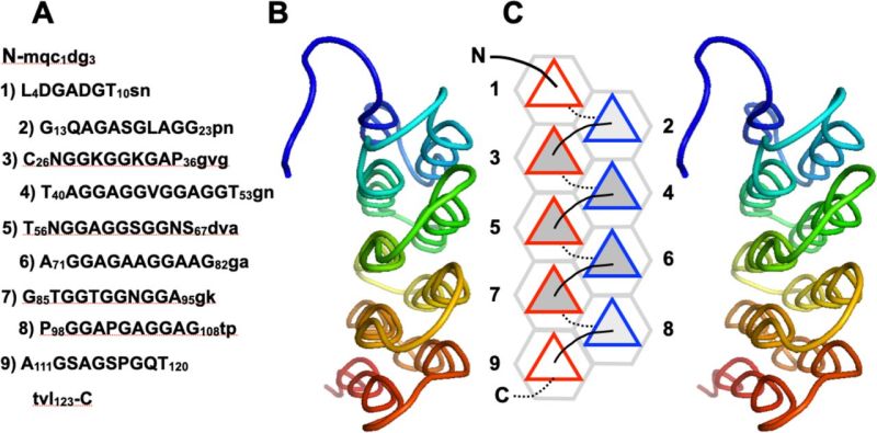 A. Primary structure of GrAFP. Residues in PPII helices (which are numbered) are shown in capital letters, others are written in lowercase.