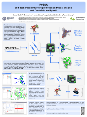 [edit]PySSA is written in pure Python and is among the first programs to utilize WSL2 in a production environment. It employs multiple instances of PyMOL, designated as User PyMOL, for direct user interaction with objects (proteins or protein pairs), and auxiliary PyMOLs, which are background instances utilized for tasks such as image rendering or distance analysis. The protein prediction is facilitated by ColabFold, which operates exclusively within the WSL2 environment. The WSL2 utilizes a specialized AlamaLinux distribution that includes ColabFold pre-installed.ColabFold communicates with a web server, MMSeqs2, to execute the MSA necessary for structure prediction.