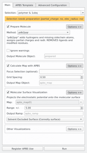 Screenshot of the "APBS Electrostatics" plugin with all options extended.