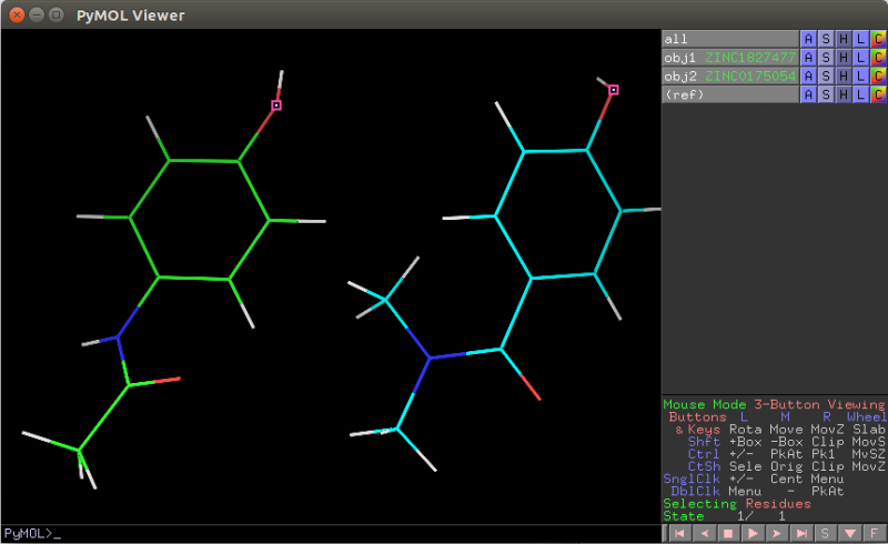 | current | 09:51, 18 November 2015 | 861 × 527 (35 KB) | JanezKonc (talk | contribs) | Screenshot of PyMOL Viewer screen displaying two molecules (the reference and one of the target molecules from the target database) side by side. 2D LiSiCA. The corresponding atoms of the substructure common to both the molecules is visualized/highlighte |