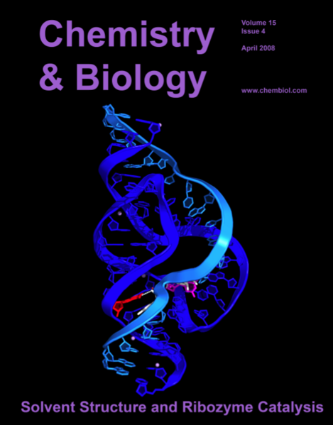 Ribbon pymol image of full-length hammerhead ribozyme with Mn2+ bound, April 2008 Chemistry and Biology cover.