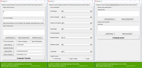 [edit]MOLE 2.5 is available as a GUI application with in-built molecular browser enabling user interactive work; command-line application and PyMOL & Chimera plugin. Some functionality is also available via online web service.
