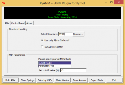 After a successful installation, go to Pymol-->Plugin and you will see PyANM, click on it and you should see PyANM's interface just like in figure 1.
