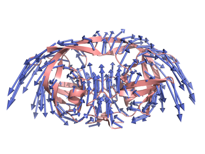 [edit]Instead of making movies for different modes, you can also draw arrows for each residue for different modes. Each arrow's direction will point to the direction where the residue will move and each arrow's length will indicate the moving scale for each residue.