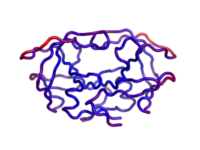 One can also calculate the Mean Square Fluctuations (MSF) with all the modes calculated by ANM. ANM has been successful in getting high correlations between its calculated MSFs and experimental b-factors for most cases. Here PyANM allows you to color the structure based on its calculated MSFs just like Pymol colors a structure with its b-factors. Here the spectrum is from blue to red corresponding to from low values to high values.
