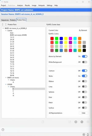 PySSA attempts to minimize the number of GUI components of the PyMOL window, providing the end-user with a nearly blank PyMOL viewer window to ensure that they are not distracted by buttons, command line interfaces, or log messages. This approach aims to provide a more intuitive user experience and PySSA is focusing exclusively on proteins and protein pairs within PyMOL. It should be noted that, at the present time, it is only possible to adjust (e.g., alter the color or representation) entire chains, rather than individual atoms. This represents a significant regression in the functionality for standard PyMOL users but ensures that the interaction remains centered on the end-user and easily understandable for those who work mainly in a laboratory.